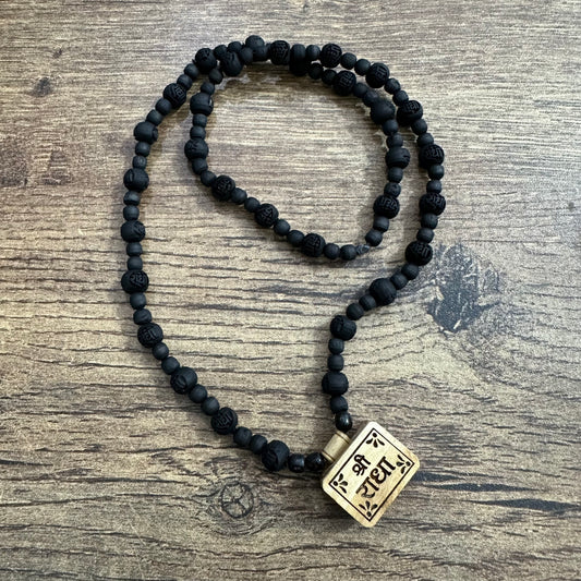 Shri radha bhaktmaal tulsi mala with black radha engraved pure tulsi beads 24 inch